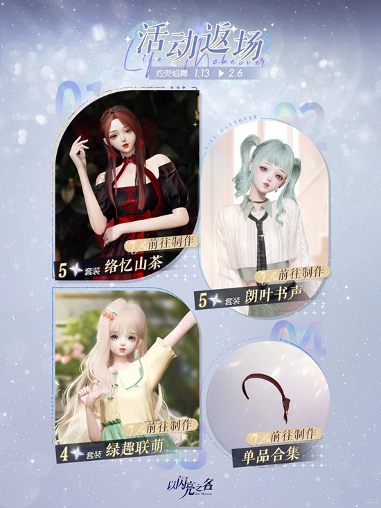 以上就是以闪亮之名活动返场制作【灼荧焰舞】1月13日限时开启的全部内容了,更多游戏资讯,攻略内容敬请关注切游网,您的支持是我们努力的动力!