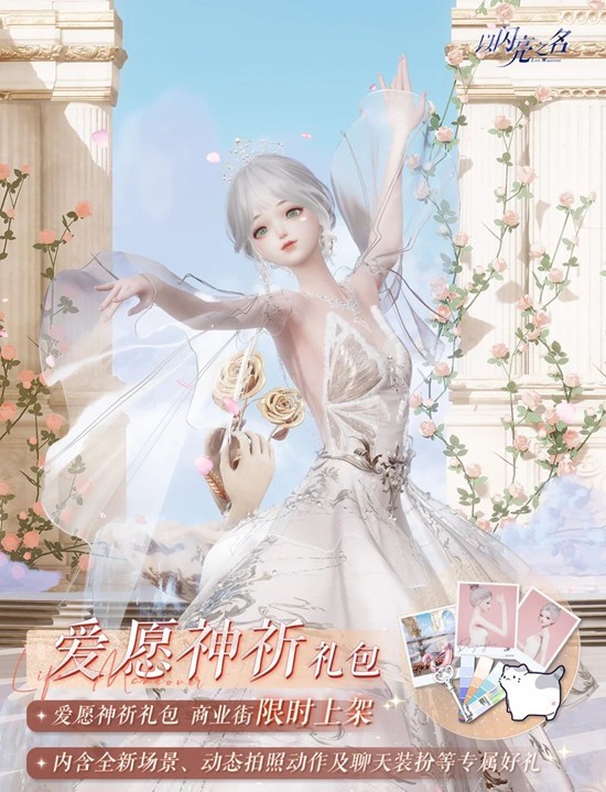 4.爱愿神祈复刻外观礼包:限时礼包售卖期间,合伙人可以4.6折的价格直接购买爱愿神祈外观礼包,内含摄像机镜头动态动作【浪漫复兴诗】、拍照场景【爱神圣域】、拍照动作【寻梦同游】、拍照运镜【浪漫复兴诗】、背景音乐【浪漫复兴诗】、聊天气泡【跟我来喵】、潮流色卡*26和遇之钥*40,该礼包永久限购1次。