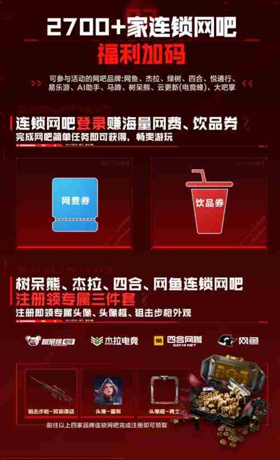 参与活动的网吧品牌包括网鱼、杰拉、绿树、四合、悦通行等,完成网吧简单任务即可获得网费券、饮品券,让你的游戏时光更加惬意。