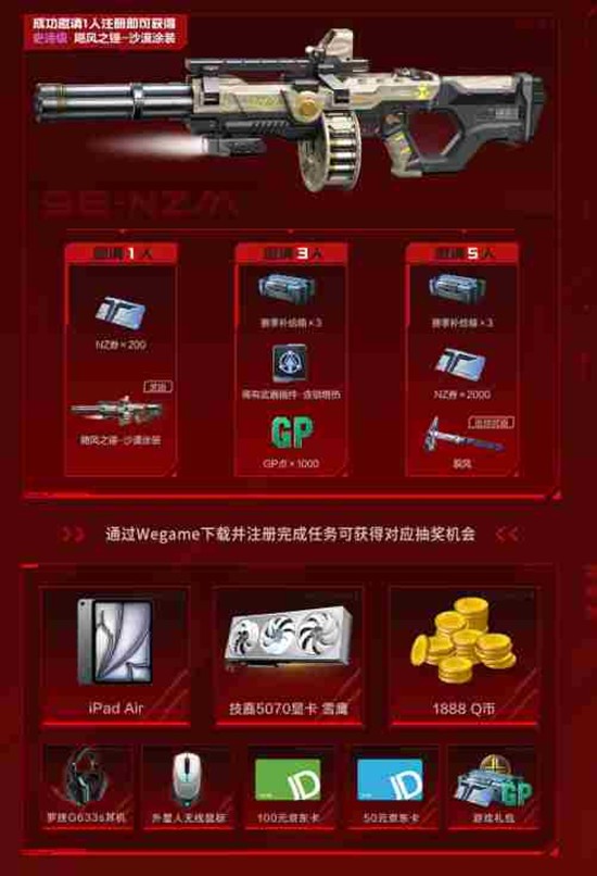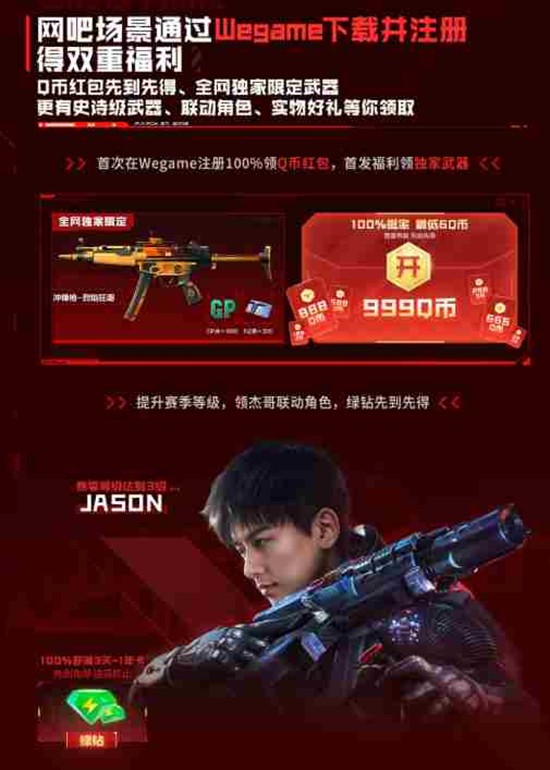 通过Wegame下载并注册《逆战:未来》,玩家将获得双重福利。首次在Wegame注册100%领取红包,首发福利领独家武器。提升赛季等级,领张杰联动角色,绿钻先到先得。