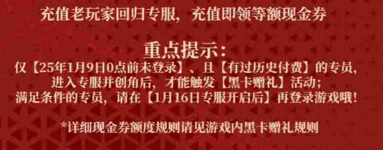 要参与龙族卡塞尔之门的黑卡赠礼活动,需要满足两个条件。首先是账号的最后登录时间必须在2025年1月9日零点之前,其次是该账号有过充值记录。当玩家在1月16日庆典专服开启后,前往该服务器创建新角色并登录,系统便会自动触发这个活动。需要注意的是,务必等待专服开放后再进行操作,提前登录旧服务器可能会影响活动资格的判定。