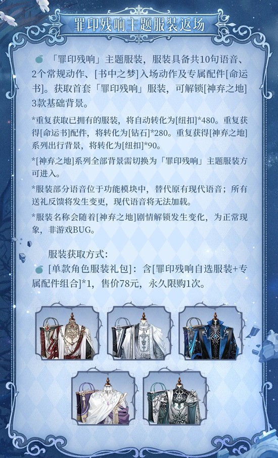 [单款角色服装礼包]:含[罪印残响自选服装+专属配件组合]*1,售价78元,永久限购1次。