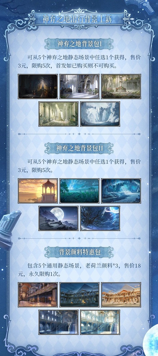 神弃之地背景包:可从5个神弃之地静态场景中任选1个获得,售价3元,限购5次,首发如已购买则不可购买。