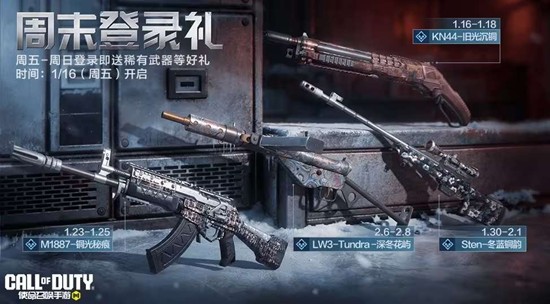 KN44-旧光沉铜(稀有级武器)开开开箱×2驰礼冬途宝箱×1福利点券×20周末连续登录3天再送额外100点券。