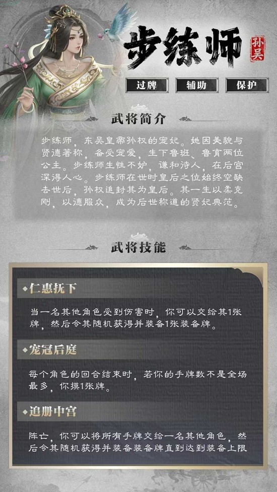 武将背景:步练师,东吴皇帝孙权的宠妃,以美貌与贤德著称,生下鲁班、鲁育两位公主。步练师生性不妒,谦和待人,在后宫深得人心。步练师在世时皇后之位始终空缺,去世后,孙权追封其为皇后。其一生以柔克刚,以德服众,成为后世称道的贤妃典范。