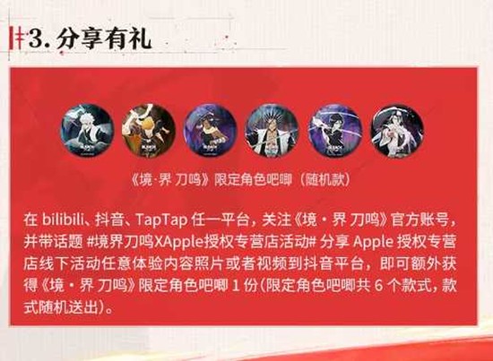 限定角色吧唧随机送在抖音/bilibili/TapTap带话题#境界刀鸣XApple授权专营店活动#分享现场照片/视频,并关注官方账号,再得6款随机角色吧唧1份,限量10万份。
