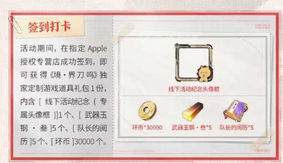 独家道具礼包签到即得「线下活动纪念头像框」×1、武器玉钢·参×15、队长的阅历×5、环币×30,000,限量30万份,先领先得。