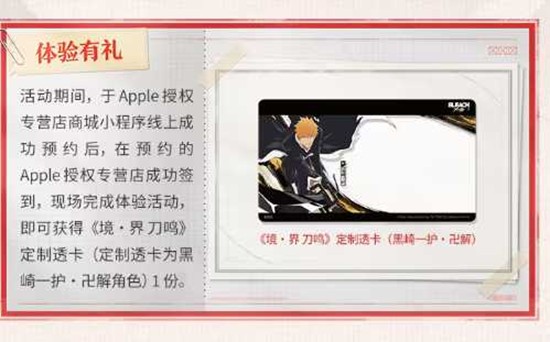 黑崎一护定制透卡现场完成试玩体验,即可领取「黑崎一护·卍解」定制透卡1份,共30万份。