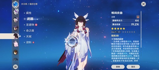 ●专属武器:副属性88.2%暴伤,提供大幅生命值、月曜反应伤害加成,并在触发月曜反应或伤害时恢复14点能量,每18s触发1次,基本每轮循环中触发1次,降低一定的充能压力;