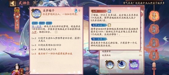二技能:被动,神无月和入梦携带者获得40%的减伤,其他友方20%。战斗开始时,获得美梦必成(携带者初始御魂4件套御魂效果概率和基础概率提升为100%)。