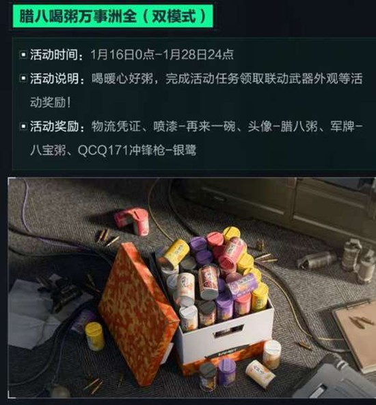 参与方式:登录游戏即可领取“银鹭暖心粥”道具完成每日“喝粥”任务(如累计淘汰、参与对局等)任务进度达标后,可在活动页面直接领取以下奖励:联动武器外观(史诗品质)腊八主题头像框&军牌哈夫币、医疗补给箱等实用道具、