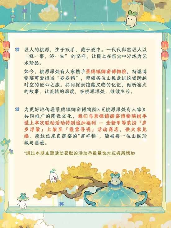 为更好地传递景德镇御窑博物院×《桃源深处有人家》共同推广的陶瓷文化,我们与景德镇御窑博物院携手送上本次联动活动特别追加福利 —— 全新甲等装扮「岁岁浮梁」上架至「霰雪寻瓷」活动商店,供大家兑换。
