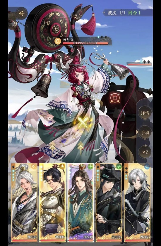 4.黄月英第一次血量清零后黄月英由于机制原因复活,此时攻击黄月英伤害为1,这个时候攻击意义不大,保持黄月英身上无剑状态后其余人防御就行,等待黄月英开大。