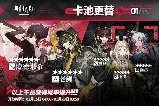 明日方舟常驻标准寻访现已更新,多个干员获得概率提升~1月15日04:00 ~ 1月29日03:59,该寻访中以下干员获得概率提升;六星干员隐德来希 / 老鲤(占6★出率的50%)五星干员烈夏 / 小满 / 衡沙(占5★出率的50%),一起来和小编看看吧~