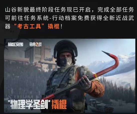 山谷地图“新貌”最终阶段任务已解锁,前往任务系统-行动档案完成“累计撤离2次”与“搜刮山谷物资点5处”,即可领取全新近战“考古工具”撬棍,挥击动作自带破风声,判定距离1.2米,击中头部可造成130%基础伤害,既能开箱又能拍人,真·物理学圣剑回归。
