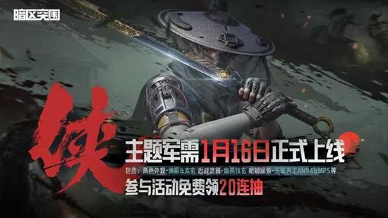 暗区突围1月16日5:00拉开年度大幕,全新“侠”主题军需正式入驻卡莫纳,登录即领二十连抽,物理学圣剑撬棍同款近战“考古工具”零门槛领取,4V4爆破玩法“英雄集结”同步开战,暗区先锋今天就能过足大侠瘾。