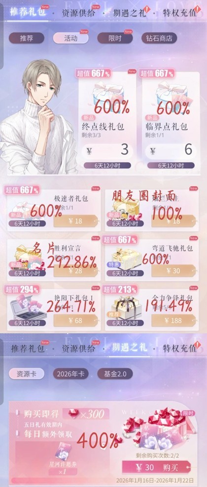 下个月就要开始新年活动了,新年卡一般为混池(144抽保底),情人节一般是ER卡(4000钻),资源不够的话要做一下取舍哦建议优先新年池