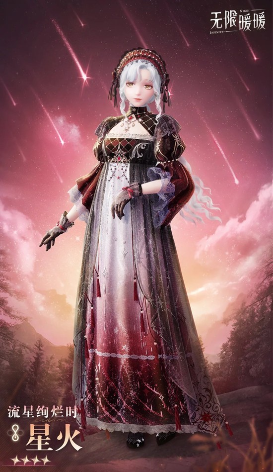 「流星绚烂时」进化后为套装「流星绚烂时·星火」。套装焕新完成后可获得「流星绚烂时·梦夜」。