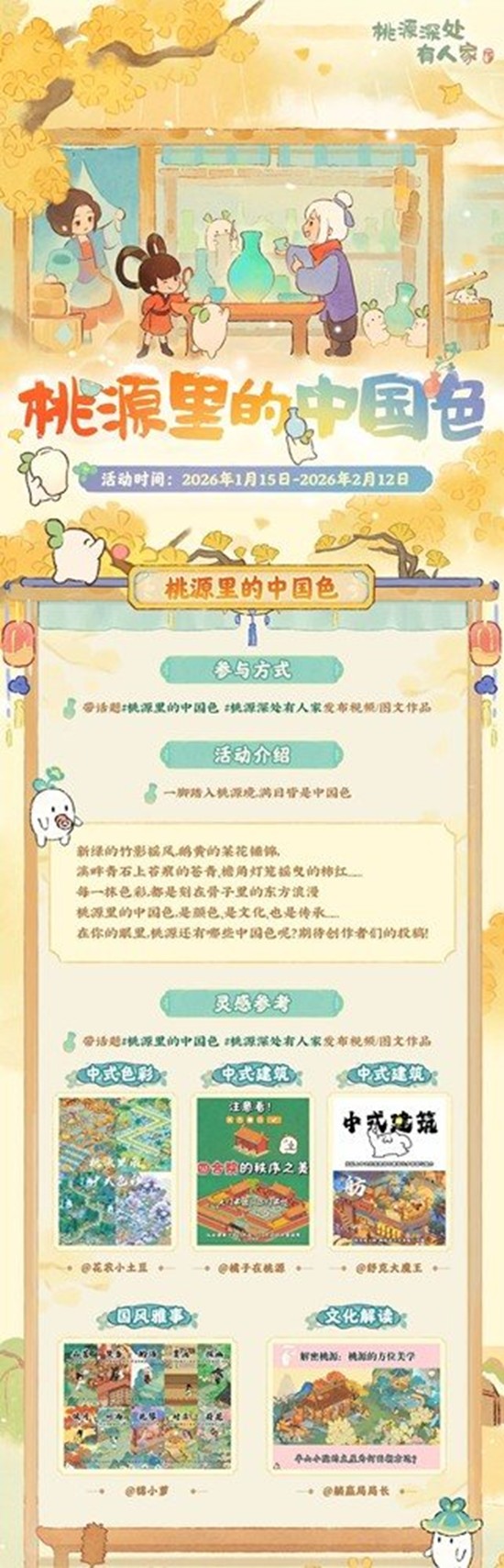 桃源深处有人家内容征集:桃源里的中国色现已开启~2026.1.15~2026.2.12,在你的眼里,桃源还有哪些中国色呢?期待创作者们的投稿!根据内容表现和内容创意,全平台综合评选具有创意的山民送出多种奖励!一起来和小编看看吧~