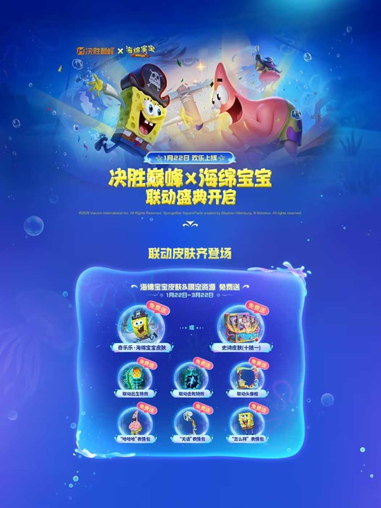 1月22日5:00,《决胜巅峰》×《海绵宝宝》联动正式揭幕,S5赛季同步进入“比奇堡时间”。官方一次性放出三大福利板块:海底餐厅主题玩法、双主角限定皮肤、全系列局内特效,活动周期从1月22日延续至3月11日,足够覆盖整个寒假。