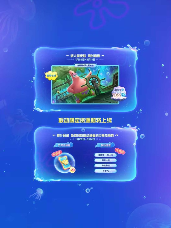 登录福利:1月22日-1月28日累计登录7天,额外送蟹黄币×30、联动语音包×1(大厅及局内可使用“我准备好了”“章鱼哥你最棒了”等5条语音),以及S5赛季积分卡×2。