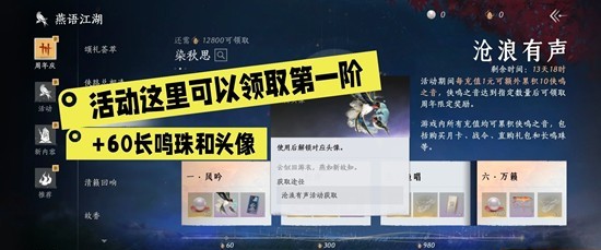 这样,加上【沧浪有声】第一阶能领取60长鸣珠、还有好看的头像一个、跟一张雀临华台礼盒拾音券。