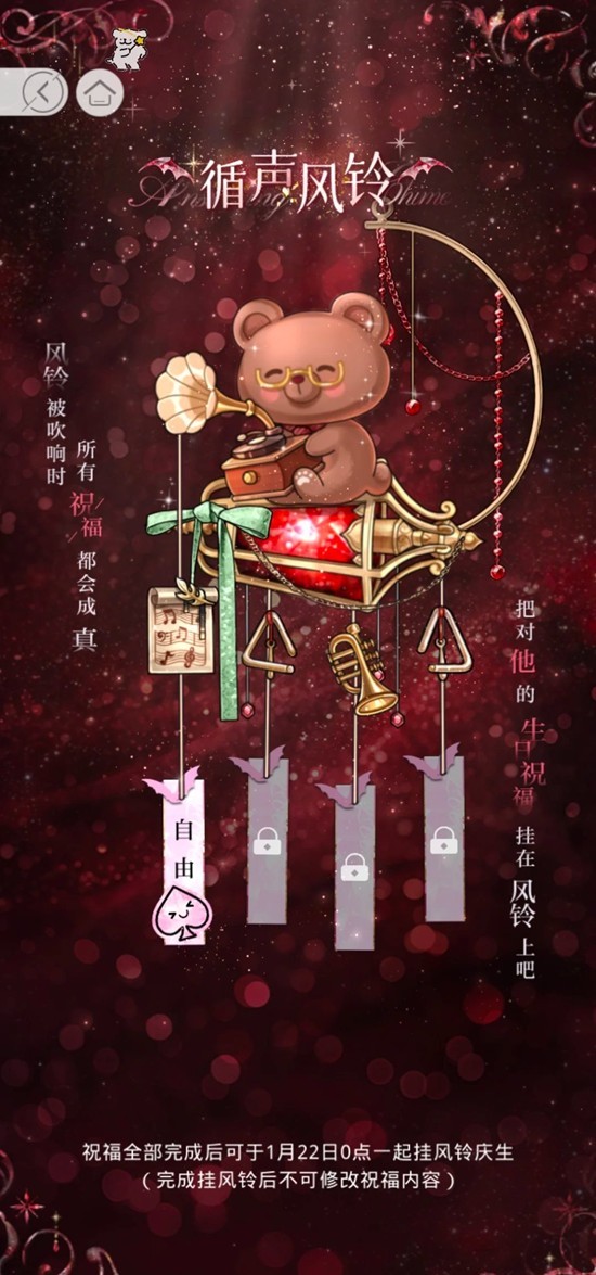 写下[循声风铃]中的全部祝福后,1月22日 00:00起将解锁Live2D祝礼互动玩法。一起挂上风铃,为他庆生。