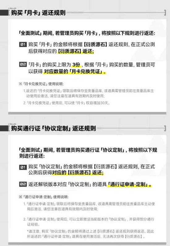 月卡购买金额同样按上述比例返源石,最多买3份,每份额外给1张月卡兑换凭证,使用后延长30天权益;通行证「协议定制」金额也计入源石返还,并返还对应「通行证申请·定制」道具,激活后无法再次获得源石。