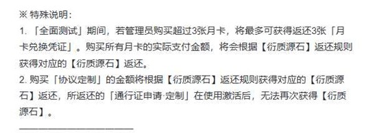 全面测试期间,单账号最多购买3张月卡可获对应数量「月卡兑换凭证」,超出3张部分只按金额返衍质源石,不再补凭证;每张凭证需前往贵重品库手动使用,激活后延长30天月卡权益,无使用期限。