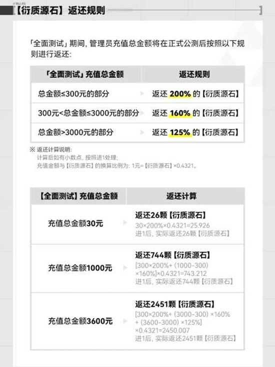 全部月卡购买金额计入充值总额,按阶梯比例返衍质源石:≤300元部分200%,300-3000元部分160%,>3000元部分125%,小数向上取整;举例买3张月卡共90元,可拿90×200%×0.4321=78颗衍质源石,外加3张兑换凭证。