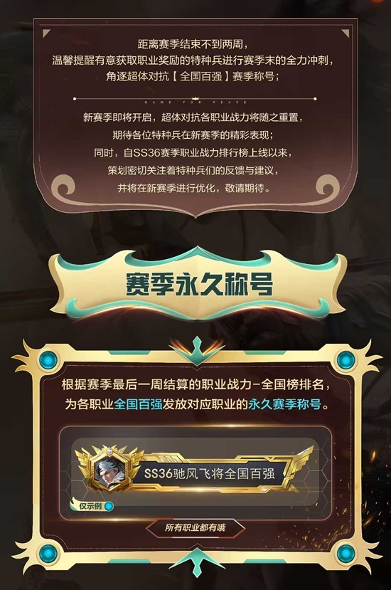 距离SS36赛季结束已不足两周,官方今日发布赛季末冲刺提醒:想要将「全国百强」永久称号收入囊中的特种兵,需在职业战力全国榜冲进各自职业前100名,赛季最后一周结算后自动发放,称号样式示例「SS36驰风飞将全国百强」,所有职业均可争夺,错过不再补发。