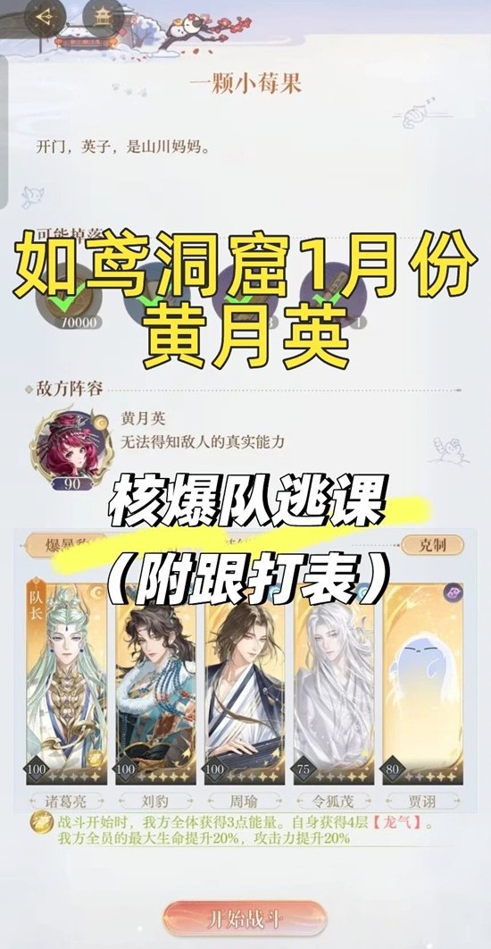 以上就是如鸢一月神秘洞窟,黄月英洞窟核爆打法配队攻略的全部内容了,更多游戏资讯,攻略内容敬请关注切游网,您的支持是我们努力的动力!