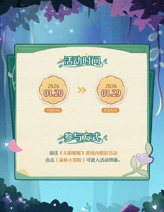 无限暖暖若生命如诗全新「森林大冒险」网页活动现已开启!2026年1月20日 — 2026年1月29日23:00,参与「森林大冒险」趣味玩法,帮助大喵躲避动植物,完成指定活动任务,可获得钻石及共鸣水晶奖励!一起来和小编看看吧~
