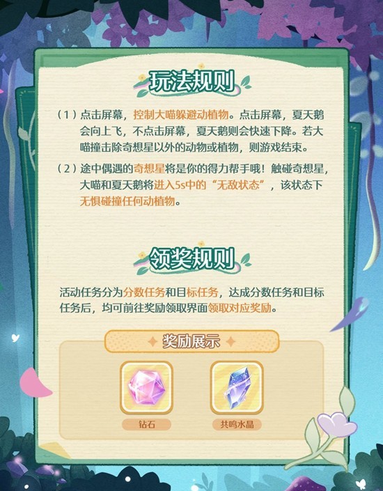参与「森林大冒险」趣味玩法,帮助大喵躲避动植物,完成指定活动任务,可获得钻石及共鸣水晶奖励!
