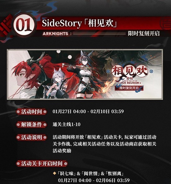 明日方舟SideStory「相见欢」1月27日限时复刻开启~活动期间将开放「相见欢」活动关卡,玩家可通过活动关卡作战、完成相关活动任务以及活动商店获取相关活动奖励,一起来和小编看看吧~