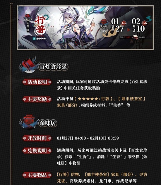 活动说明:活动期间,玩家可通过活动关卡作战完成[百灶食珍录]中相关任务获取奖励