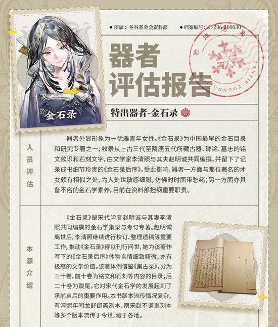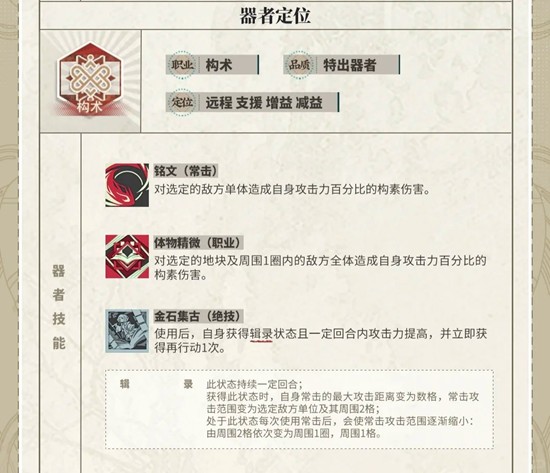 物华弥新游戏中有着众多角色,他们被称为“器者”,分为轻锐、远击、宿卫、构术、战略五个职业,特出、优异、新生三种稀有度。那么游戏中新器者金石录即将登场,器者技能是什么呢?又来一个辅助构术,而且和赤壁赋页有一定的联动。技能具体怎样,少爷,小姐,让我们一起来分析一下吧。
