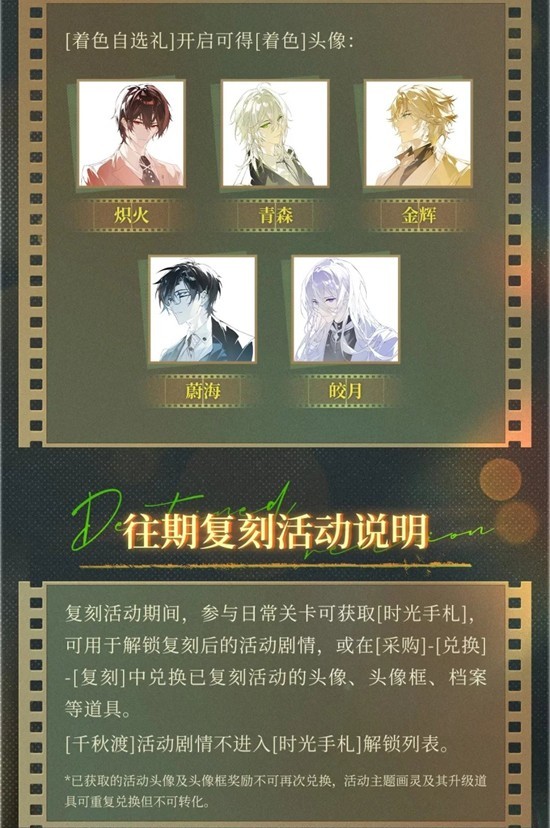 活动复刻期间<练习>里的副本会掉落<时光手札>可以开往期剧情或复刻商店里换头像框、头像、档案袋