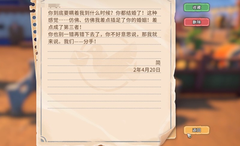 只有当玩家因为“不专一”的行为而被对方结束关系时,才会收到这封代表关系彻底终结的信件。这个设定让沙石镇时光中的社交互动显得更加真实和具有代入感。