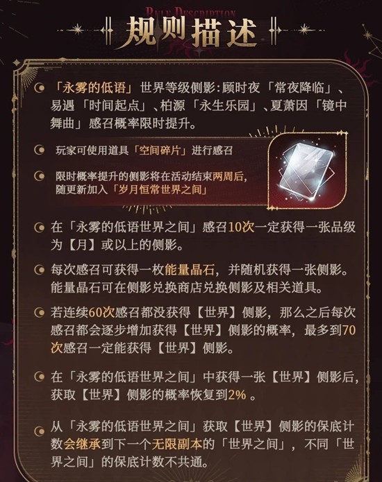 ✦「永雾的低语」世界品级侧影感召概率限时提升,玩家可使用特殊道具“空间碎片”进行感召。