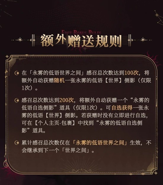 ✦感召总次数达到200次,将额外自动获赠一个“永雾的低语自选侧影”道具(仅限1次),可自选获得一张永雾的低语【世界】侧影。