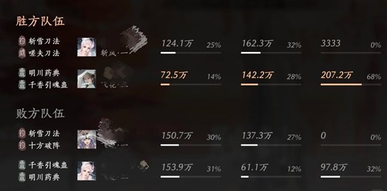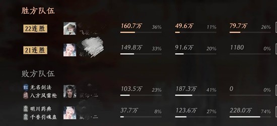 当队友和我的血量恢复了,我们就选择打血量不健康的霖霖,那个钧钧太会跑又能输出了。还好对面霖霖那会儿奶圈cd中,我抓紧机会就先把霖霖杀掉了。我整一场处决只拿到了两三个,精元很有限,所以每一次放出奇术都要想好对面可能的动作,看了下结算对面伤害打了快三百万,很厉害,所以随机应变真的很重要。