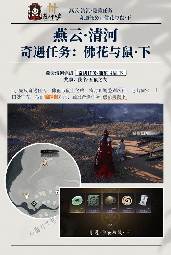 完成奇遇任务:佛花与鼠上之后,将时间调整到次日,走出洞穴,出口处往左,找到锦绣鼠对话,触发奇遇任务佛花与鼠下
