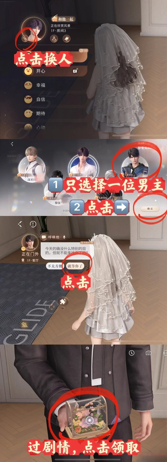 1.每个男主初次上门送的新居礼物永生花稀有度为璀璨,可邀请其他男主,看完初始剧情就能获得礼物,点击右下角装修,将礼物摆出即可。(此方法每个男主会因此增加500好感度,对此介意的可以选择第二种方法。