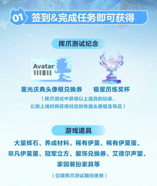 测试期间登录游戏完成签到和任务,即可获得: