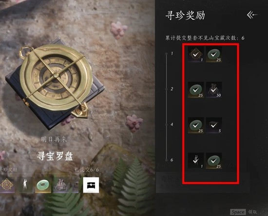 游侠可以在「奇珍宝鉴」界面追踪鹳长老及其他游侠发布的「寻珍鉴」,获取宝物;也可击败不见山「深泽」、「绥乡」和「天陉」区域内的动物或敌人,将有概率拾取其随身携带的宝物。提交一定套数宝物后,游侠可向鹳长老兑换表情动作[我最棒]、题跋[定珍盘]等奖励。