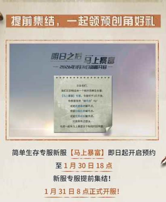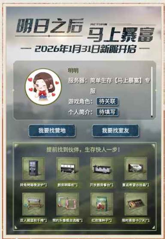 简单生存专服「马上暴富」1月31日8:00暴富开服!预创角色+找室友正当时,限时领易容卡、秋千椅、烤箱微波炉!下面让我们来一起看看吧。