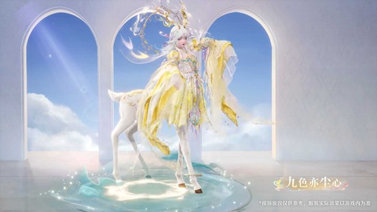「九色亦尘心」套装以"魂兮灼灼,魄兮不散"为设计哲学,将灵鹿的圣洁与典雅属性的高贵完美融合。套装采用九色鹿传说为灵感,服装纹饰细腻呈现鹿影、云纹与玉华元素,尽显国风仙侠的飘逸与大气。共鸣活动将于1月30日2.2版本「九色万相生」更新后开启。