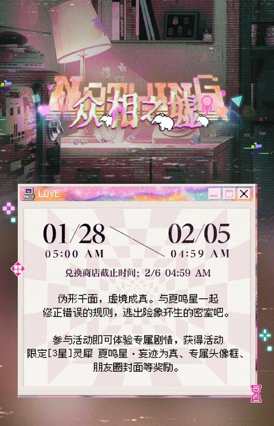 活动说明:与夏鸣星一起修正错误的规则,逃出险象环生的密室吧。参与活动即可体验专属剧情,获得活动限定[3星]灵犀 夏鸣星・妄迹为真、专属头像框、朋友圈封面等奖励。