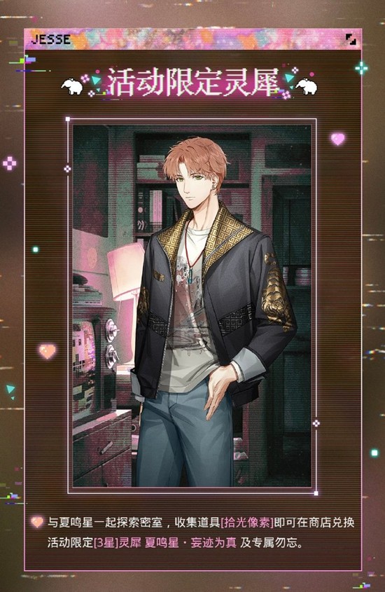 与夏鸣星一起探索密室,收集道具[拾光像素]即可在商店兑换活动限定[3星]灵犀 夏鸣星・妄迹为真 及专属勿忘。